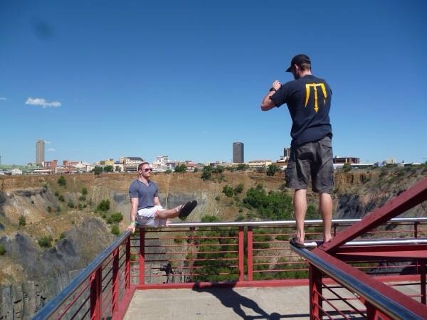 The diamond mine started out as an open pit mine in 1871. All of it was hand dug and hauled away by manual means. This was interesting to see and visit because it is also the largest hand-dug mine in the world. Viewing the hole from a suspended platform, we were able to see inside at the enormous size of this mine. It was 214 meters deep and the bottom was filled with blue water. Jesse and I proceeded to take a couple gymnastics pictures disregarding the sign about climbing on the railings, which we just so happened to miss.