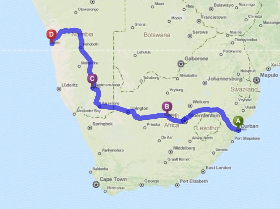 Well we decided to take a road trip to Namibia for a competition that was being hosted there. This journey would take us from the east coast of Africa all the way to the west coast. It was Allan, Jesse, and me in the Land Rover for a three day journey that covered 2575km (1600mi). Talk about a lot of driving! The route would be Durban to Kimberley the first day. Next would be Kimberley to Keetmanshoop, Namibia and then finally the third day making it to Walvis Bay. We had roughly 10 hours of driving each day.